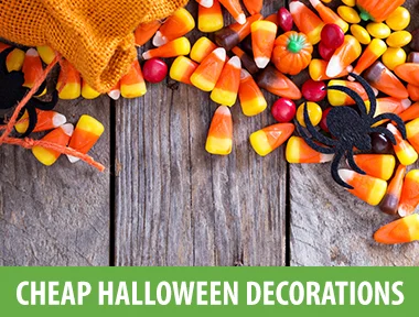 For cheap jack-o-lantern decorations that will last past Halloween, cover clean, empty jars with orange construction paper or tissue paper. Add features with black construction paper, then pop in a tea candle—with flames, or battery-operated—and watch your "pumpkin" glow.