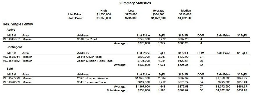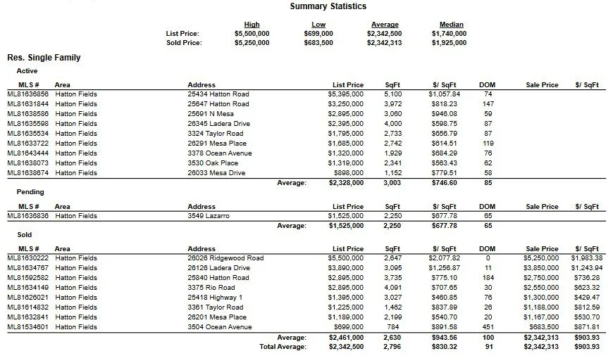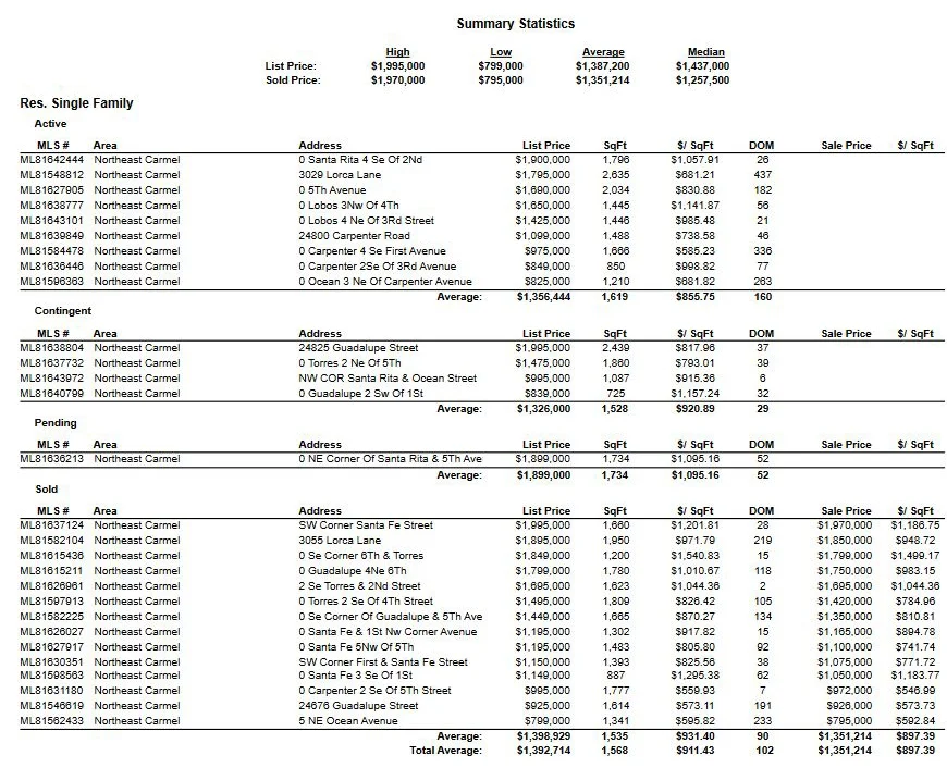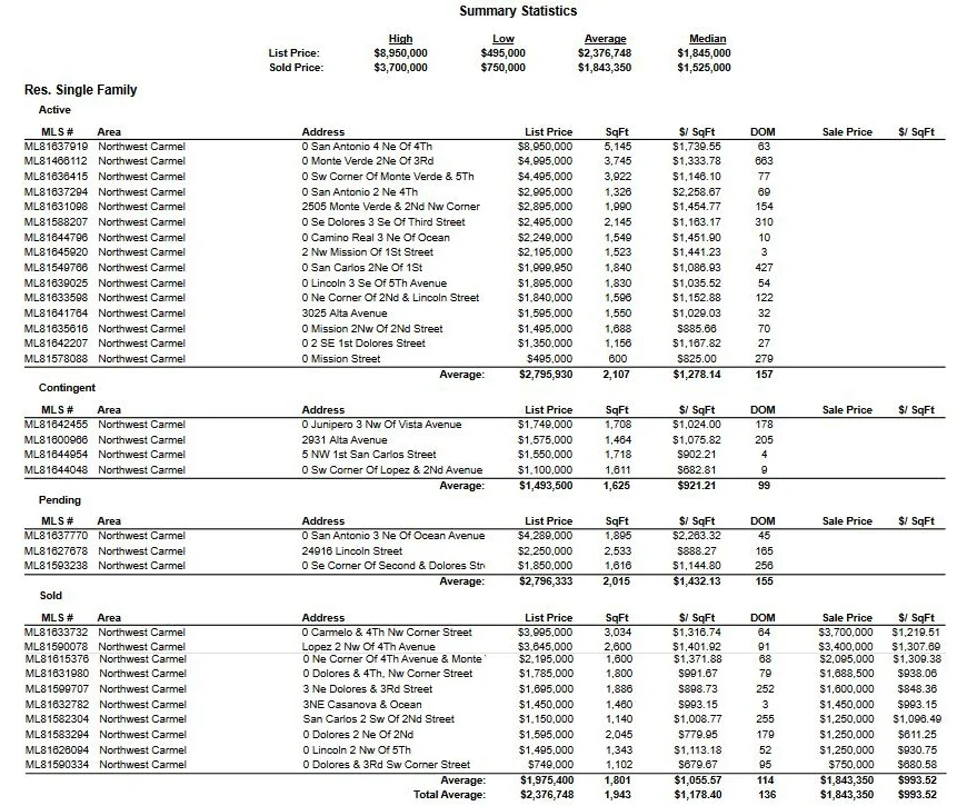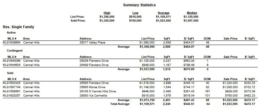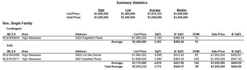 Highest List Price, Lowest List Price, Average List Price, Median List Price