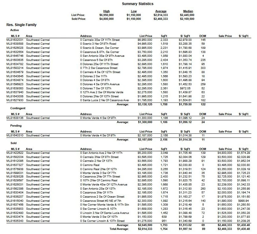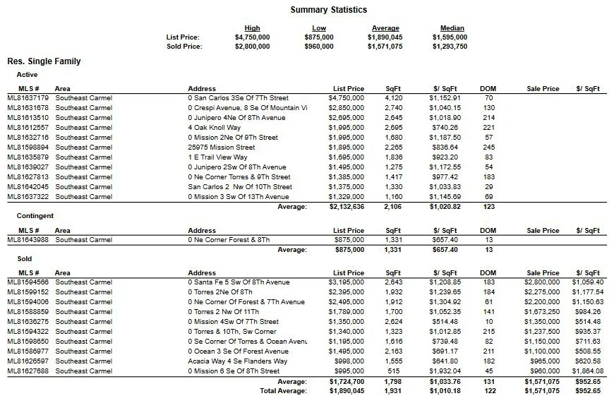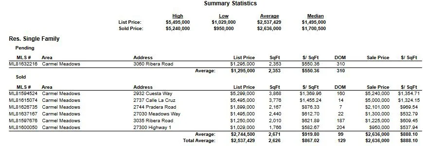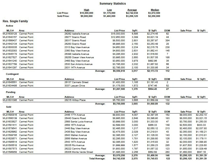 The Following is a snapshot of each of Carmel's MLS area as of April 10th, 2017 with sales going back 6 months | Area 140 - 151